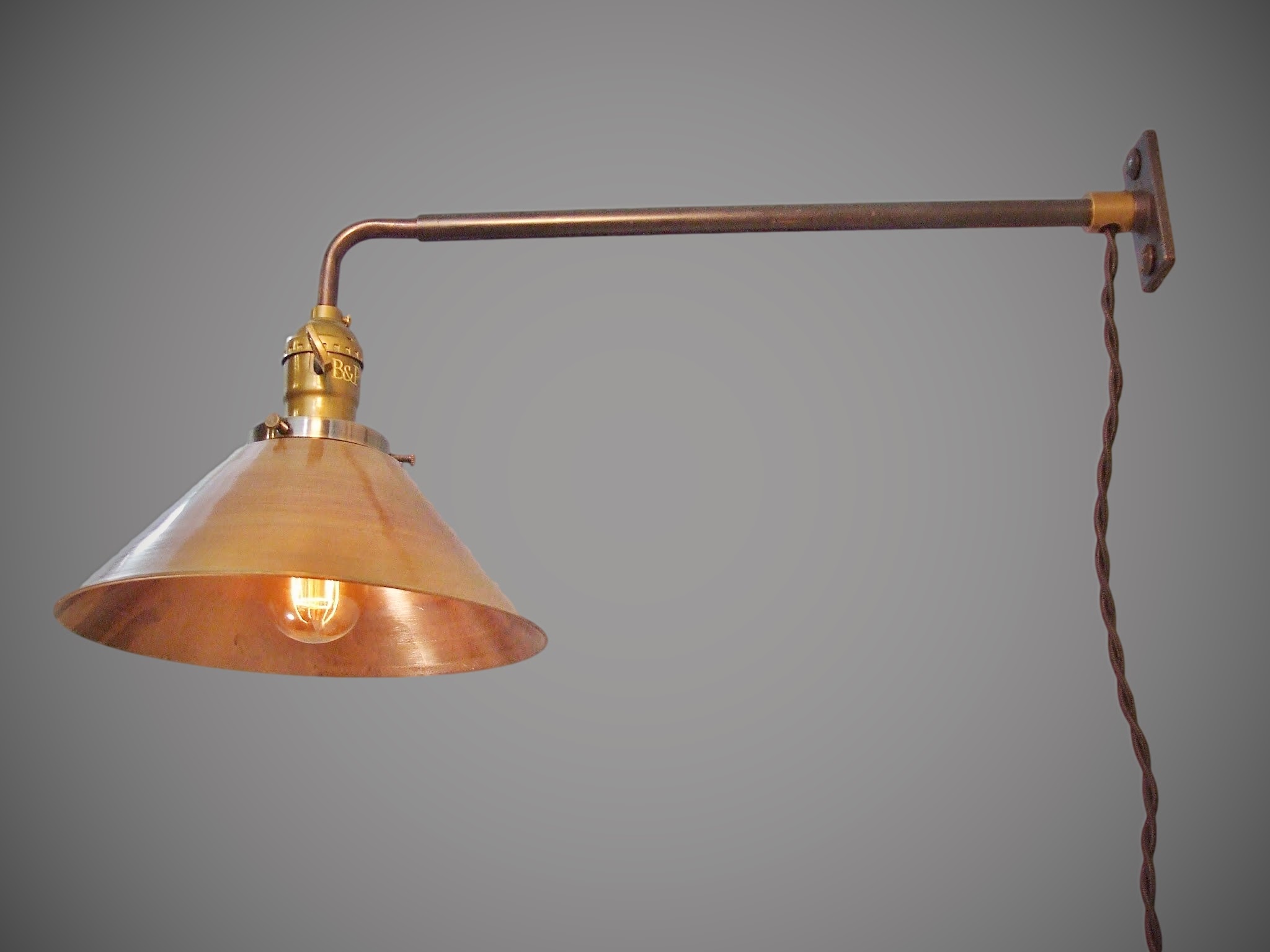 Chic vintage style wall sconce straight out of the Machine Age. Features a sleek minimalist body of solid steel with brass and iron fittings. Fixture components are aged in our shop to give each lamp a unique vintage character. The 8" cone lamp shade is raw brass, and we leave it alone, so it will continue to age naturally over time and develop the perfect patina. The lamp socket is a reproduction antique with an aged brass finish and a classic flat paddle switch. Comes with a nice length of twisted cloth cord and industrial style wall plug (cord color shown is black).