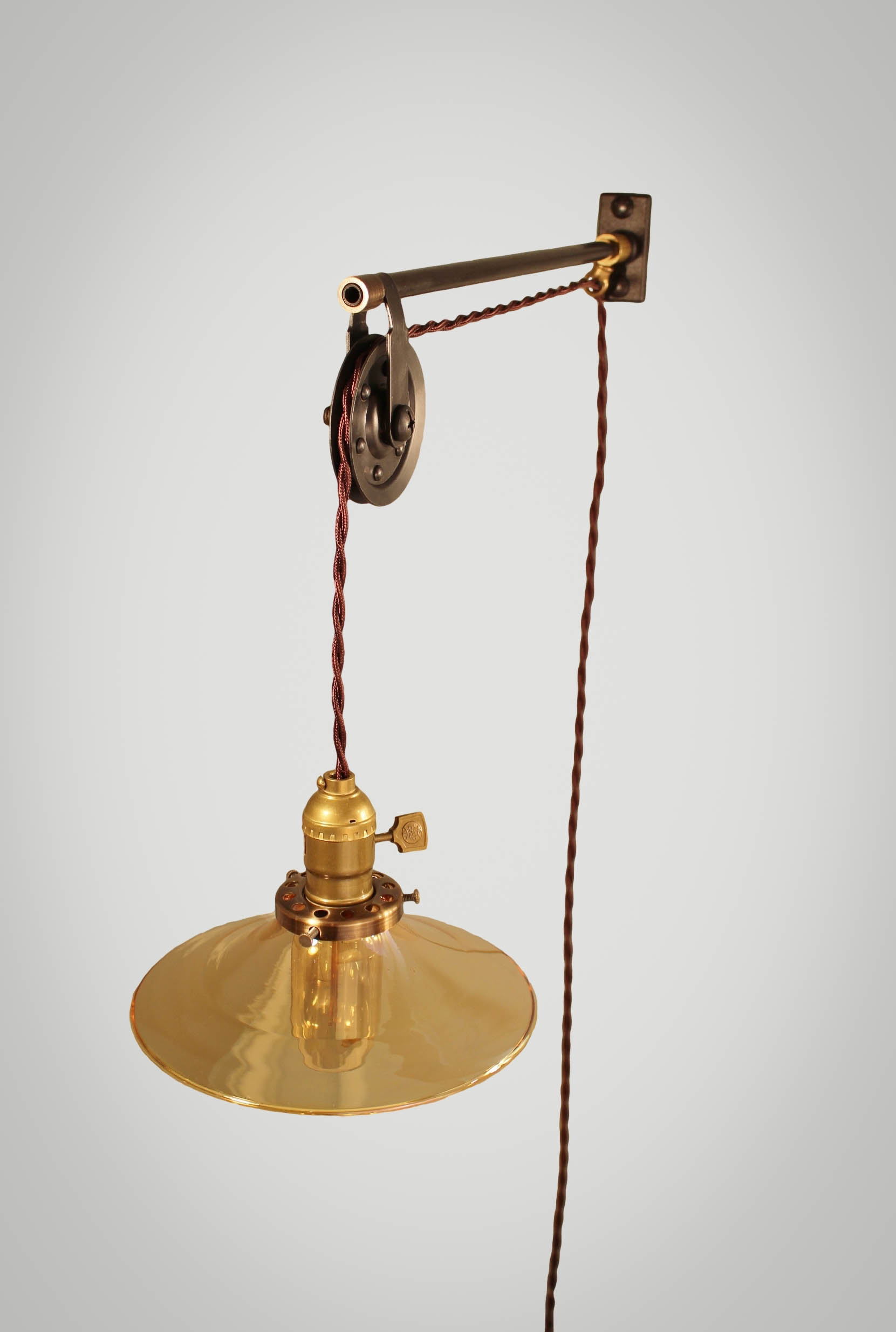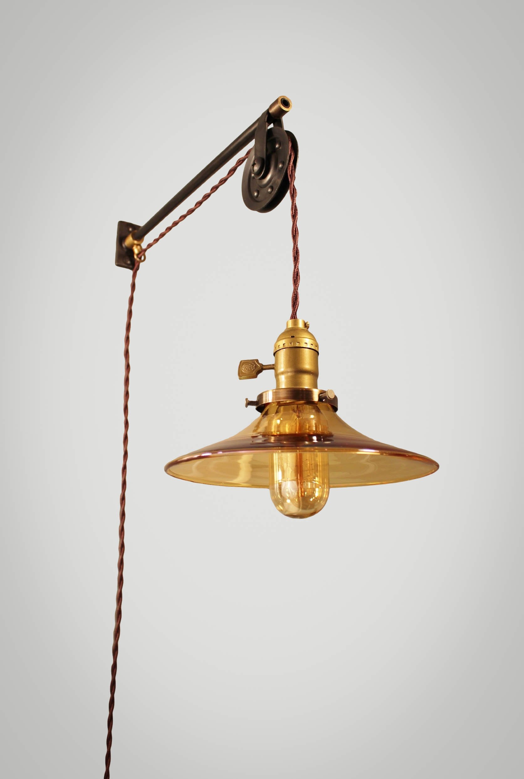 This vintage industrial style pulley lamp features study construction and all the right trimmings. Body is made of solid steel, brass, and iron components, hand-aged for vintage effect. The pendant lamp includes a reproduction antique lamp socket with an aged brass finish and a flat paddle switch. Comes standard with 9 feet of twisted cloth cord and an industrial style wall plug (cord shown in mahogany). Multiple lamp shades can be paired with this fixture. Pictures show our 7.5" amber glass shallow cone.