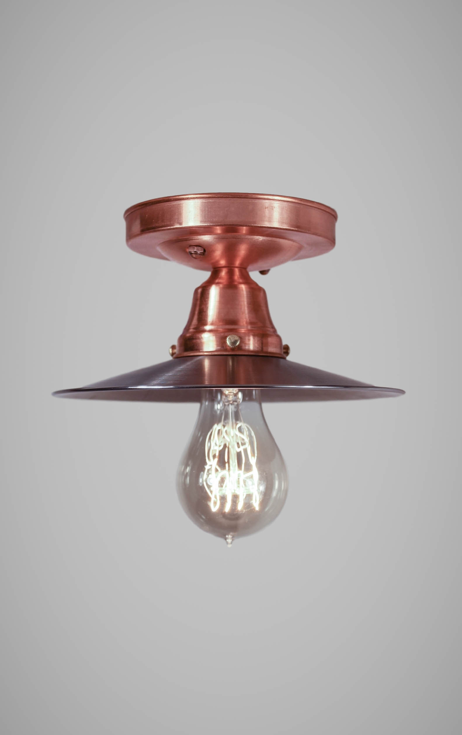 This classic vintage style ceiling light features period-correct detailing and high-quality construction of solid copper, brass, and steel. Mounts flush to ceiling or wall. The untreated copper has a "living finish," meaning that it will continue to age naturally over time and develop a rich patina.