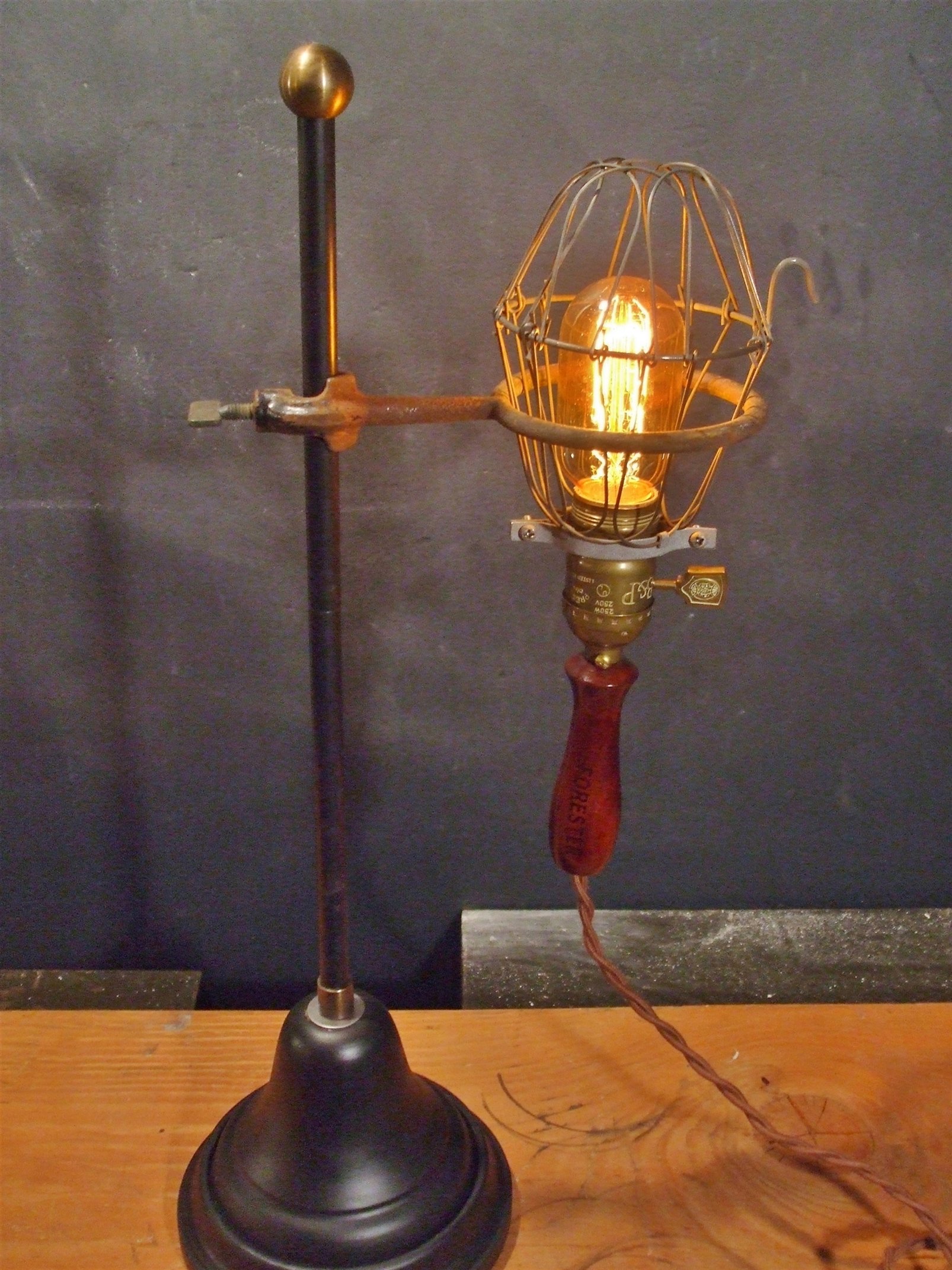 The trouble light sits on a chic vintage style laboratory stand measuring 19.5 inches high, with a 5" round footprint, and consists of a hefty metal base, steel rod, brass finial, and a vintage lab ring. The lab ring can be adjusted to various points up and down the stand, and the trouble light can be easily taken off and hung closer to work areas or danced with about the room.
