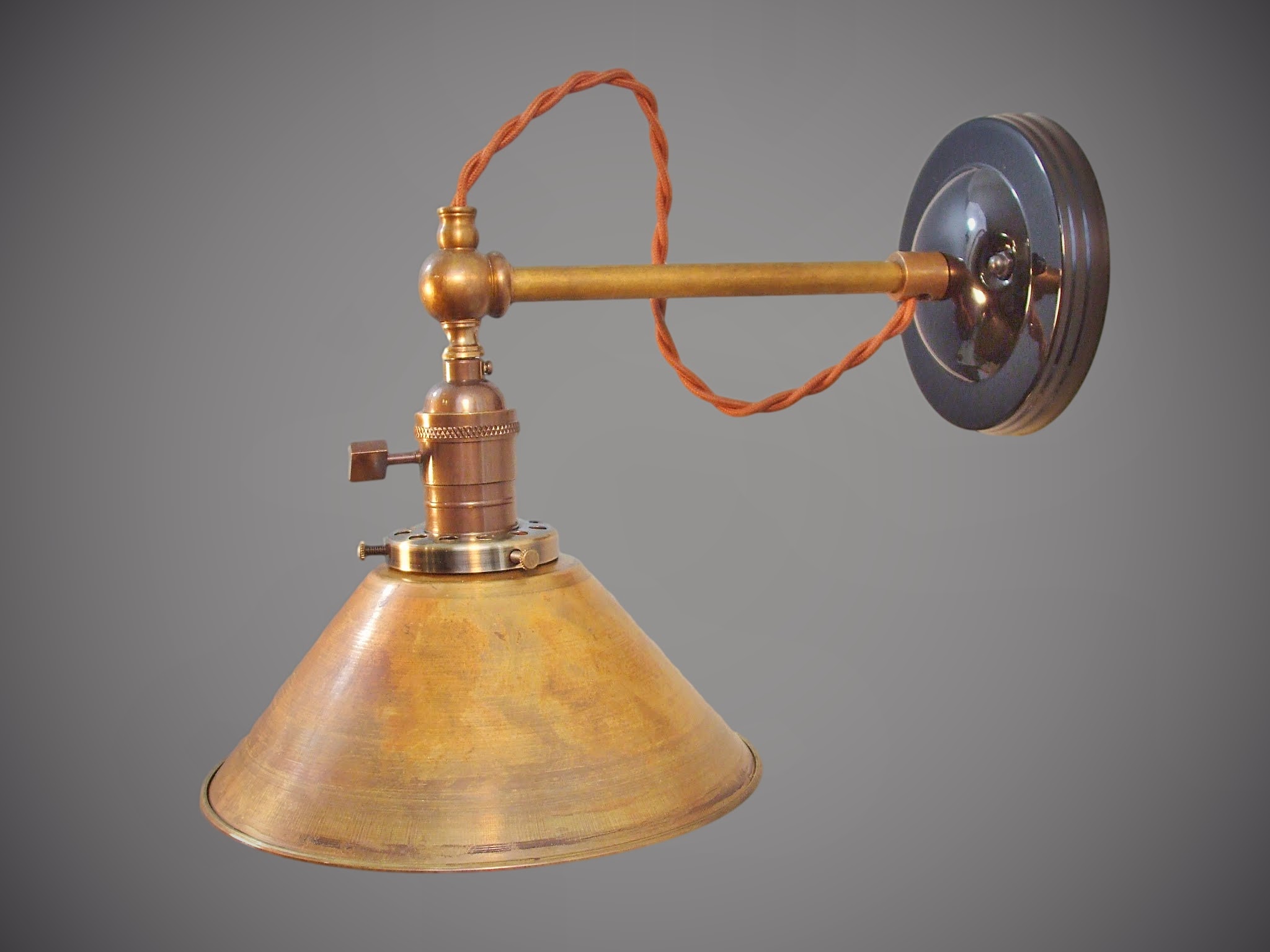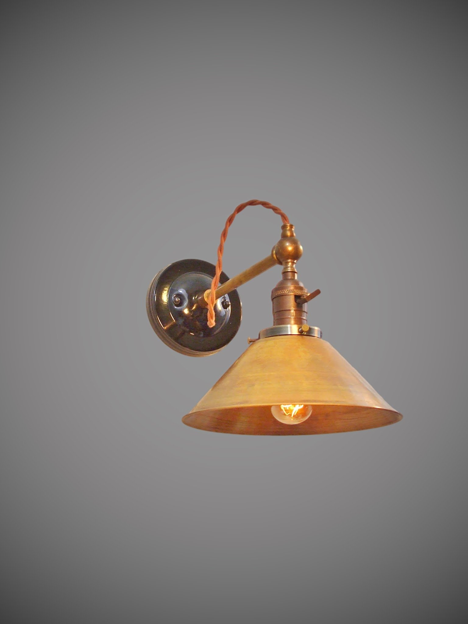 Classic industrial wall sconce with solid brass hardware and exposed cloth cord wiring. Reproduction antique lamp socket with oil-rubbed bronze finish and a flat paddle switch. Crowned with an 8" brass cone lamp shade.