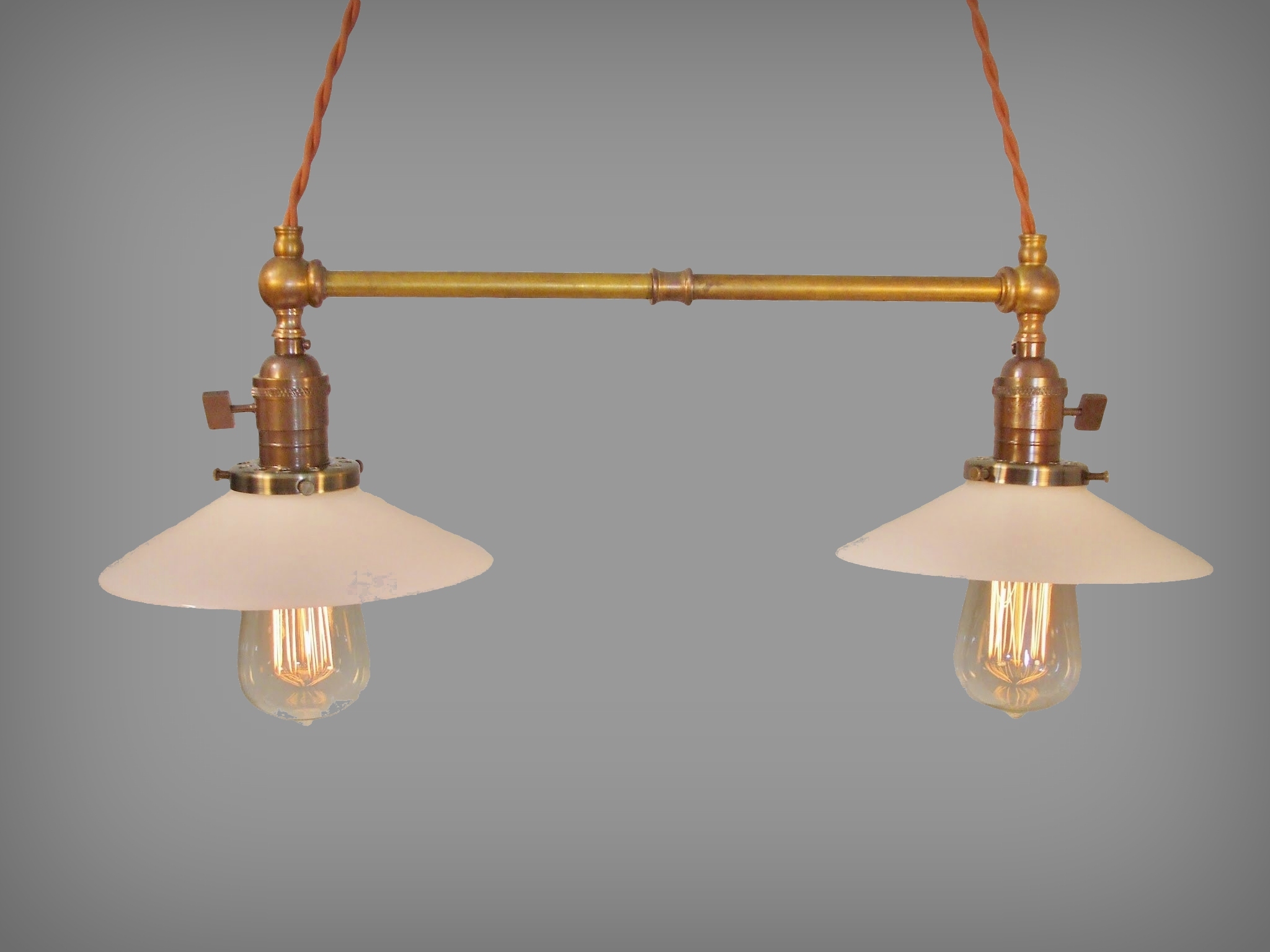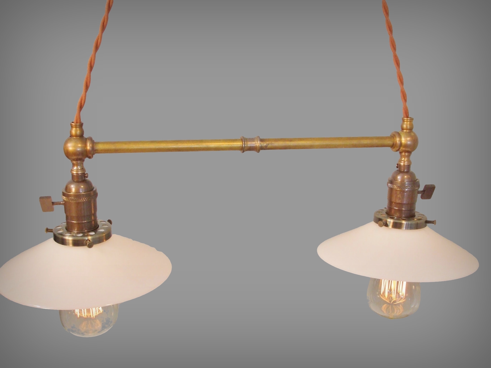 Twin pendants with crossbar. Solid brass fittings, reproduction antique lamp sockets with oil-rubbed bronze finish and flat paddle switches, opal glass shallow cone shades, and 5 feet of twisted cloth-covered cord (5 feet for each pendant). Intended for hardwire installation. Special two-hole ceiling canopy included.