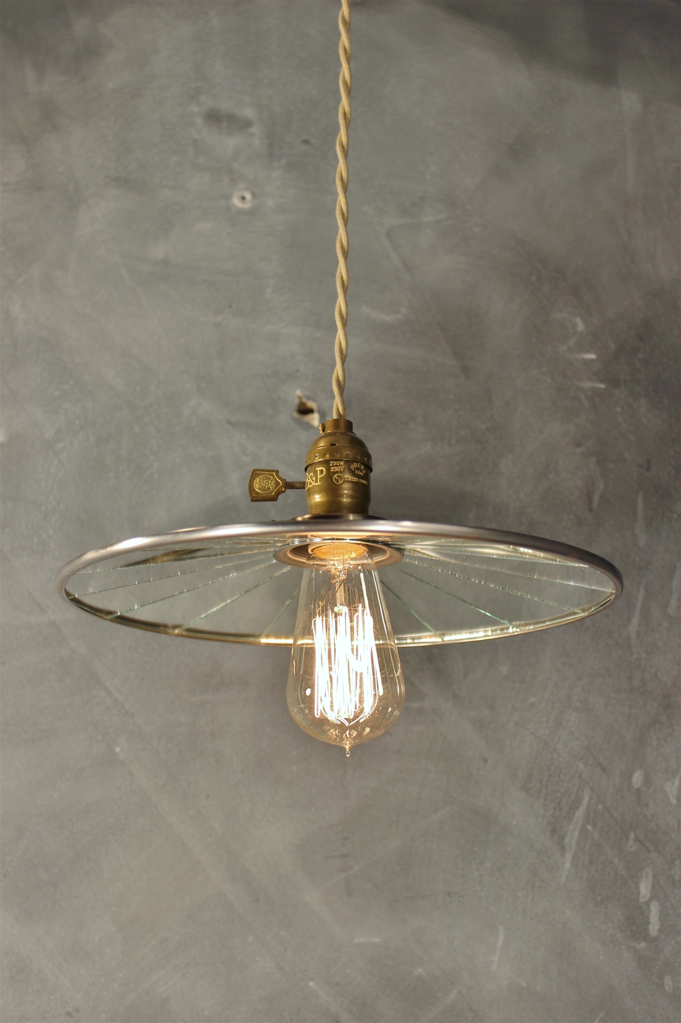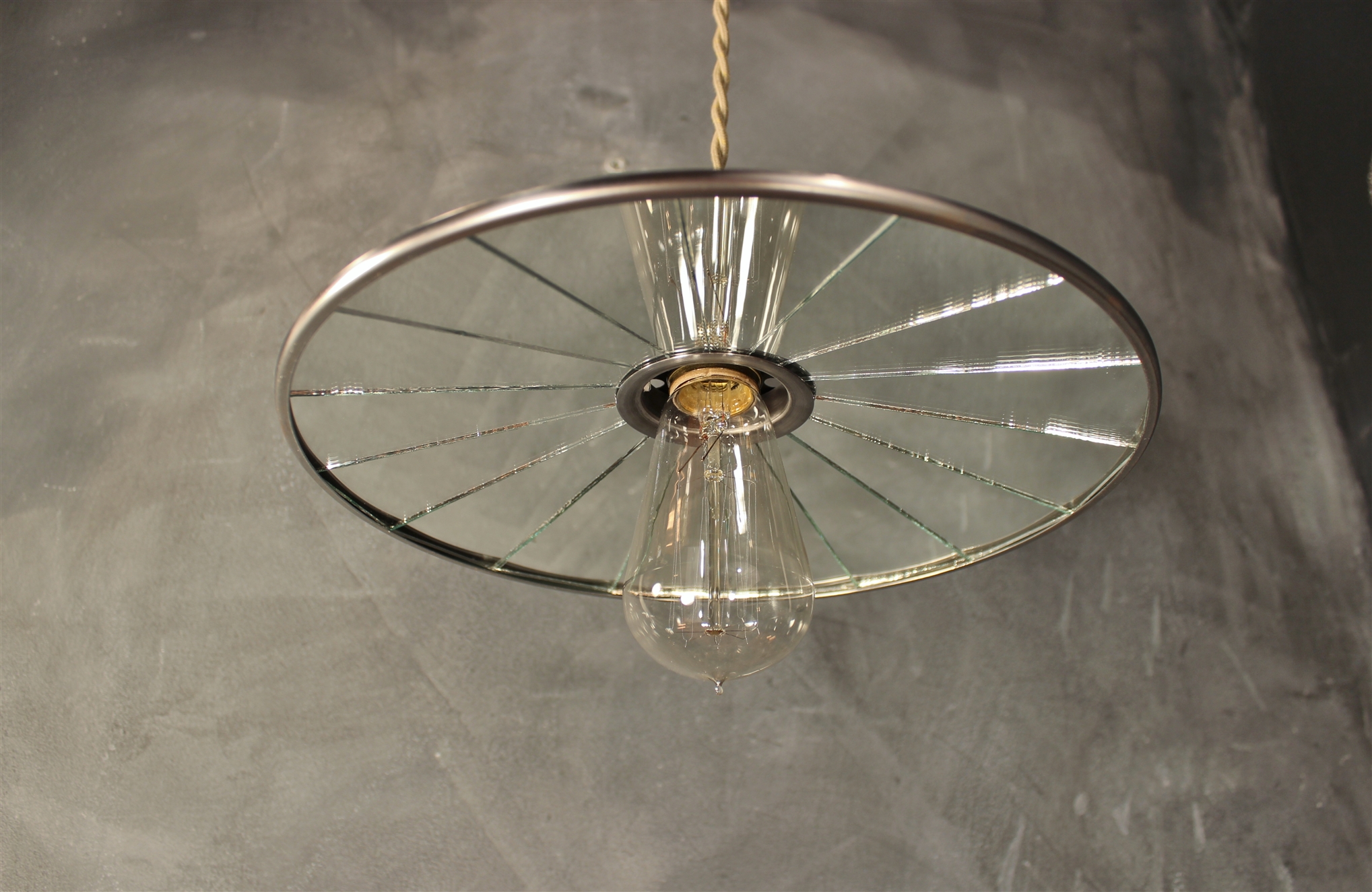 Ours is the most authentic and most robust reproduction we’ve seen. The 11.25” lamp shade is spun out of solid raw steel. The mirrored glass is hand-cut, one panel at a time, to the proper proportions of the originals. The retainer ring in the center is made of solid steel. Paired with a vintage style pendant light—aged brass lamp socket, twisted cloth cord, industrial wall plug—this thing is unstoppable.